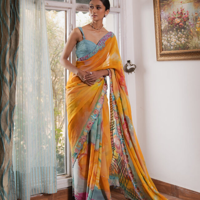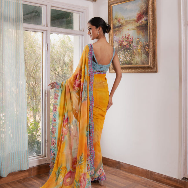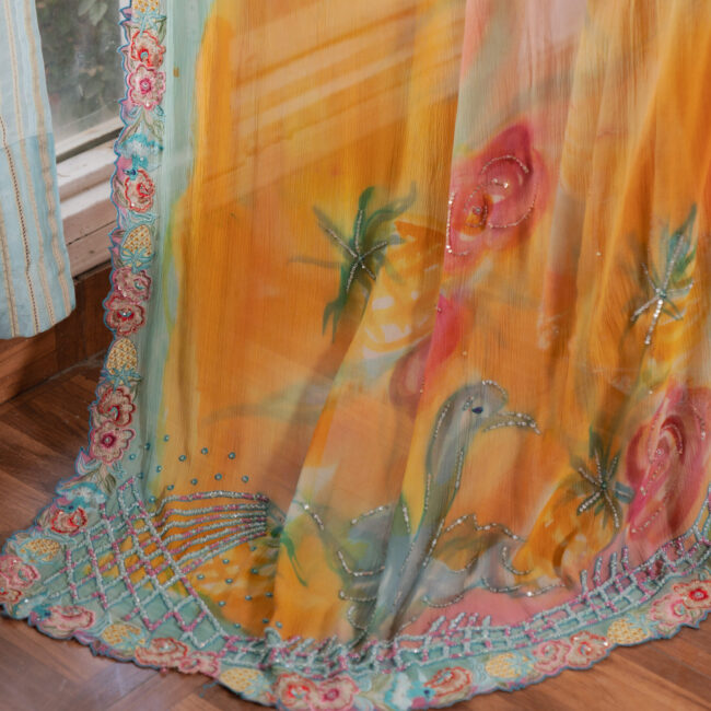 A silk-on-chiffon saree, fully hand-painted in a vibrant tropical theme with candy hues. The border features embroidered pineapples, tropical roses, and cranes with beaded criss-cross detailing. Sequins and beads trace the painted motifs on the skirt and pallu. Paired with a pleated dull blue blouse, sequined with hanging beadwork.