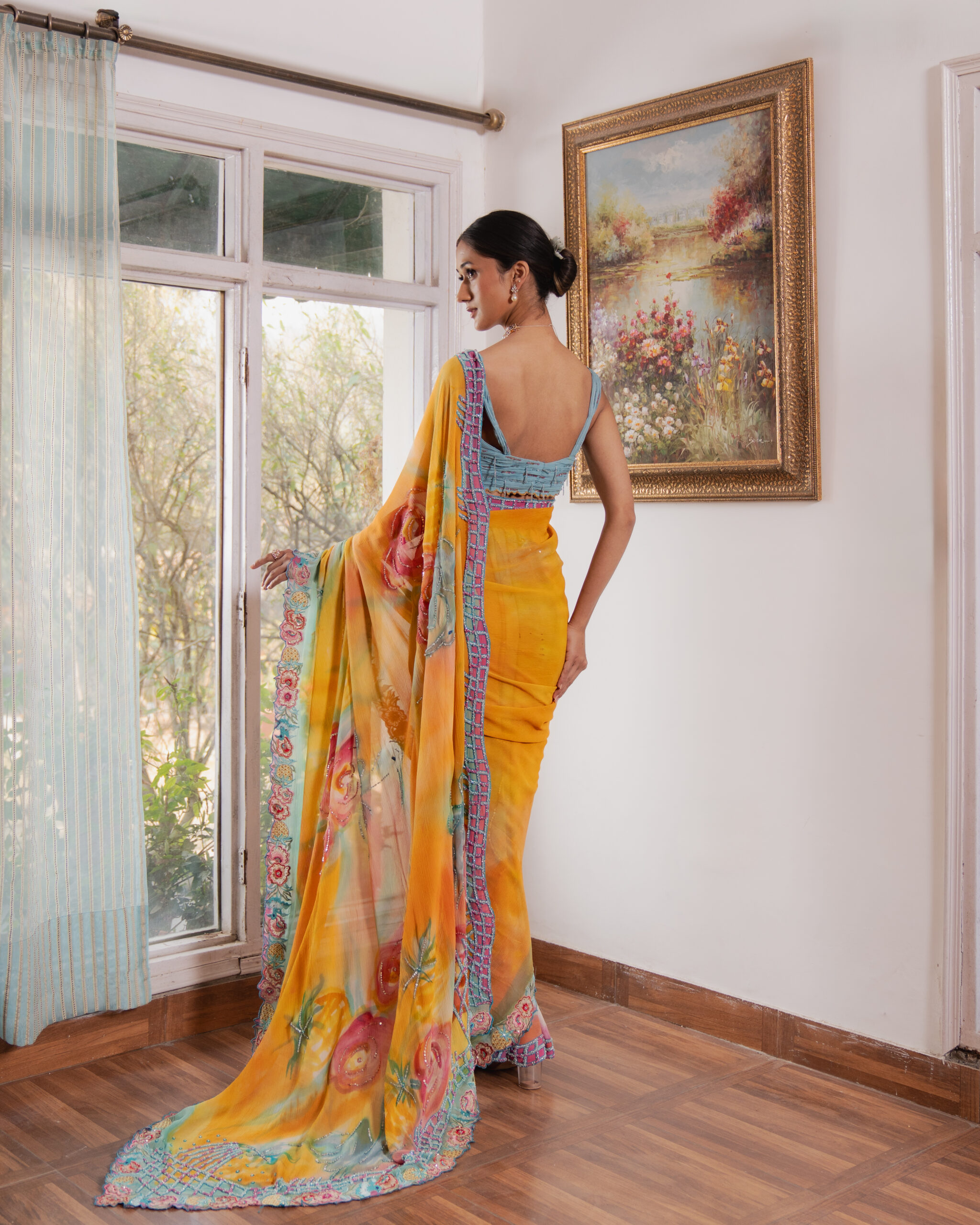 A silk-on-chiffon saree, fully hand-painted in a vibrant tropical theme with candy hues. The border features embroidered pineapples, tropical roses, and cranes with beaded criss-cross detailing. Sequins and beads trace the painted motifs on the skirt and pallu. Paired with a pleated dull blue blouse, sequined with hanging beadwork.