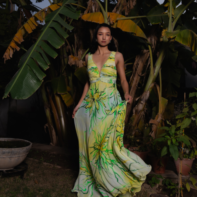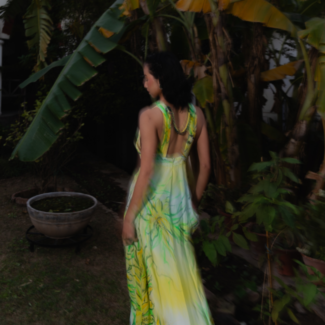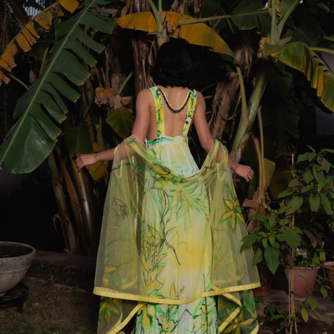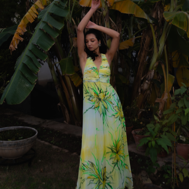 The A-line dress features a structured silhouette with a pleated lemon-yellow bossom and waistline. Delicate pleated straps extend from the shoulders to the back. Bold lilies in deep yellow, olive, and black are hand-painted, accented with sequin sprays. A painted net cape with shimmering sequins adds an ethereal touch.