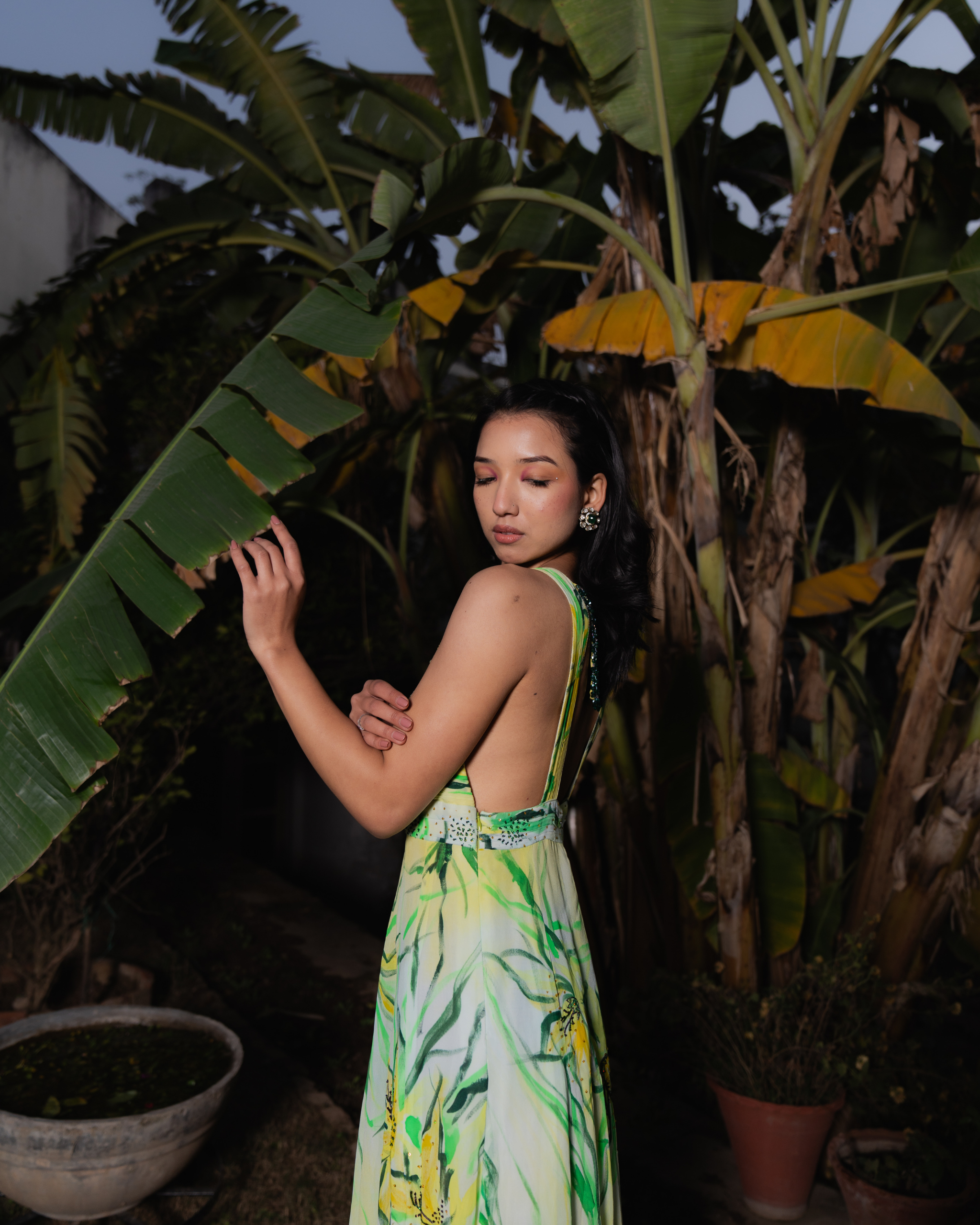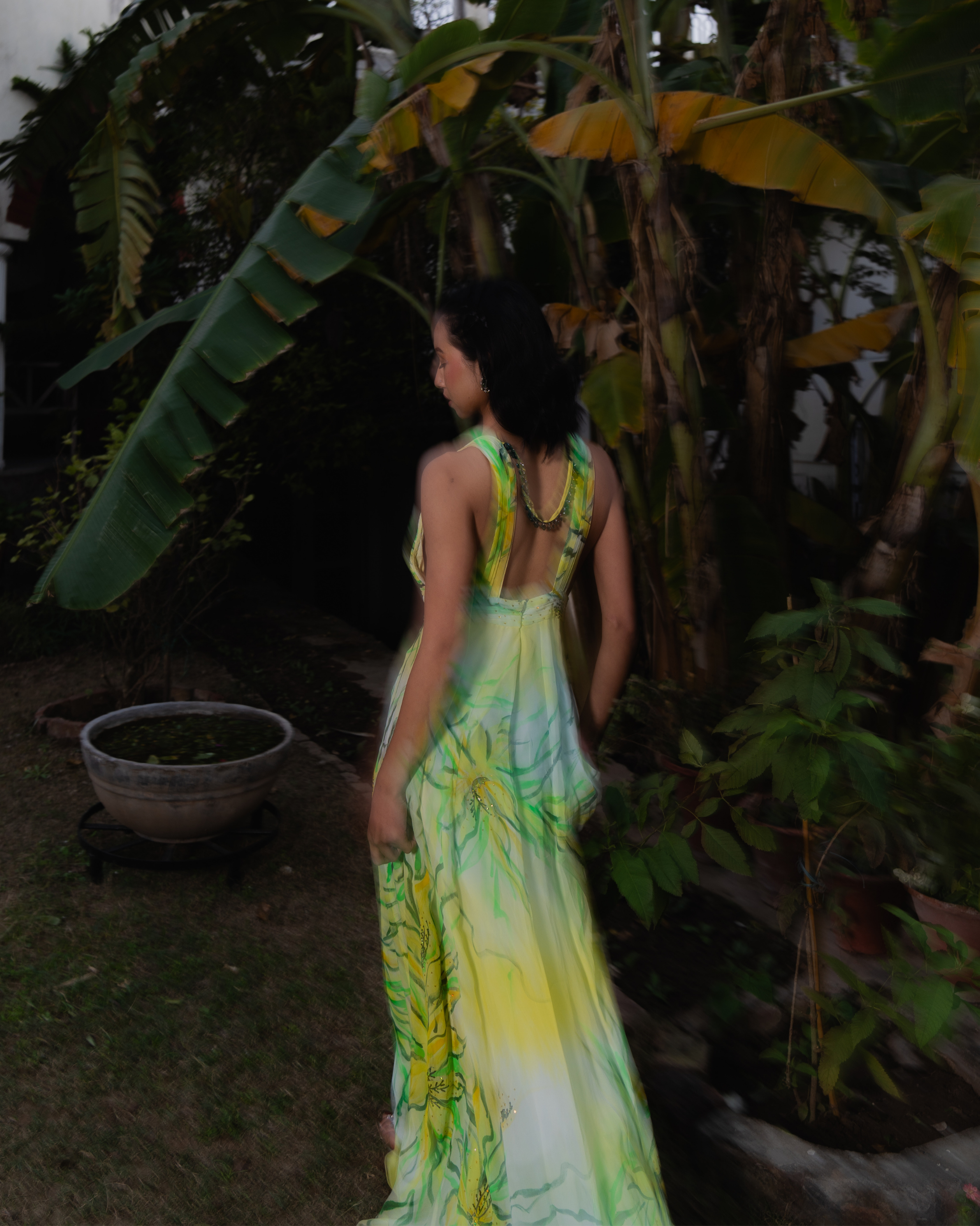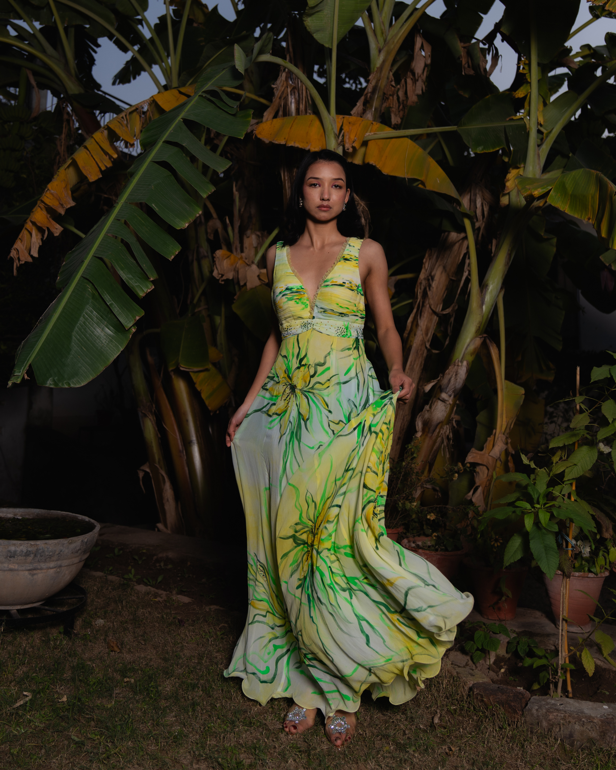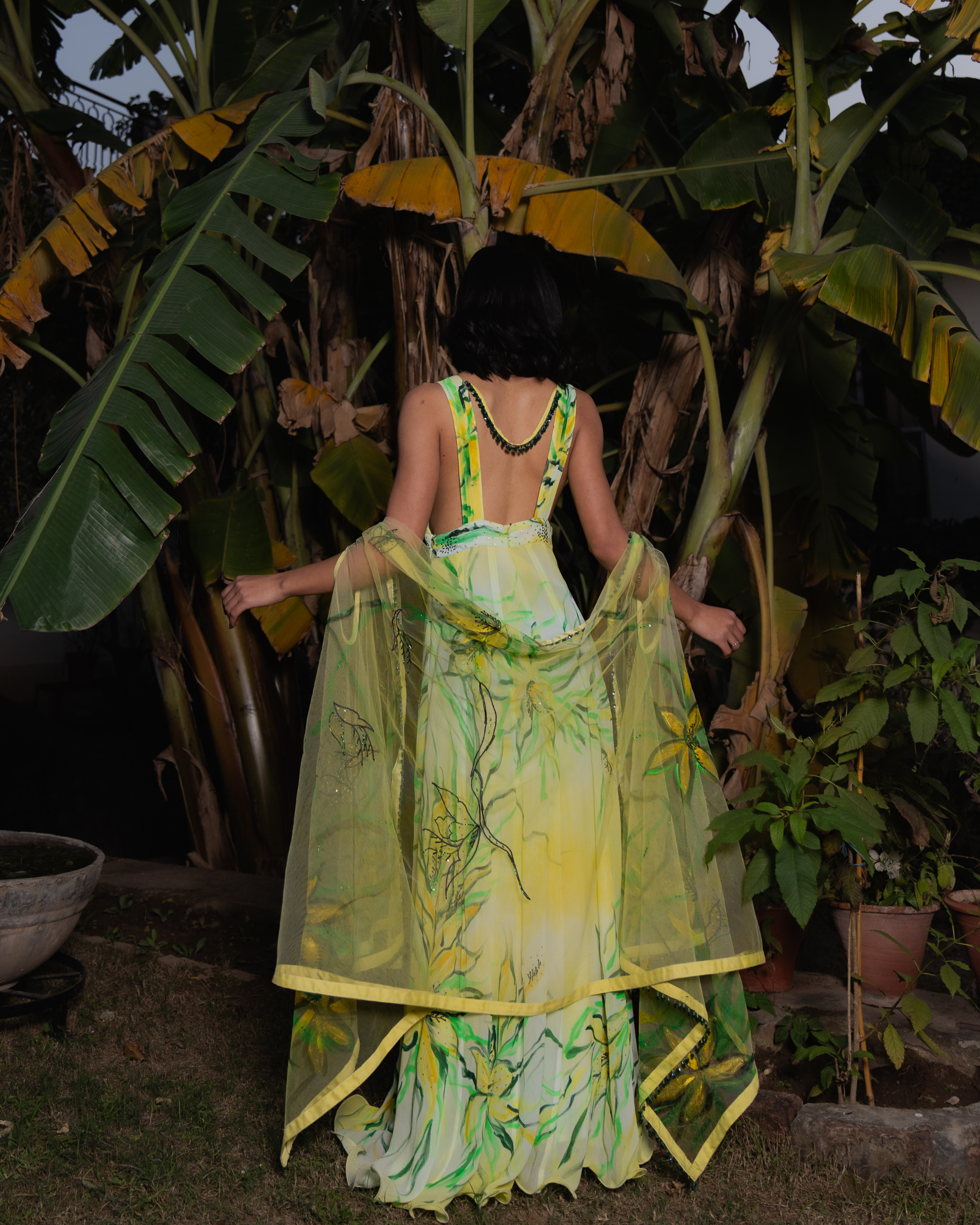 The A-line dress features a structured silhouette with a pleated lemon-yellow bossom and waistline. Delicate pleated straps extend from the shoulders to the back. Bold lilies in deep yellow, olive, and black are hand-painted, accented with sequin sprays. A painted net cape with shimmering sequins adds an ethereal touch.