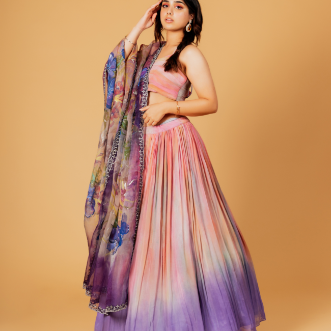 This georgette lehenga set features an ombré skirt, blending peach, pink, lilac, and sun yellow, with deeper tones at the hem and lighter hues at the waist. The pleated blouse has delicate shoulder ties at the back. The dupatta showcases passion flowers with purple trumpets, scarlet, and burnt orange buds, framed by a geometric purple and silver border. Scattered beads add a luminous touch across the flowers and throughout the fabric.