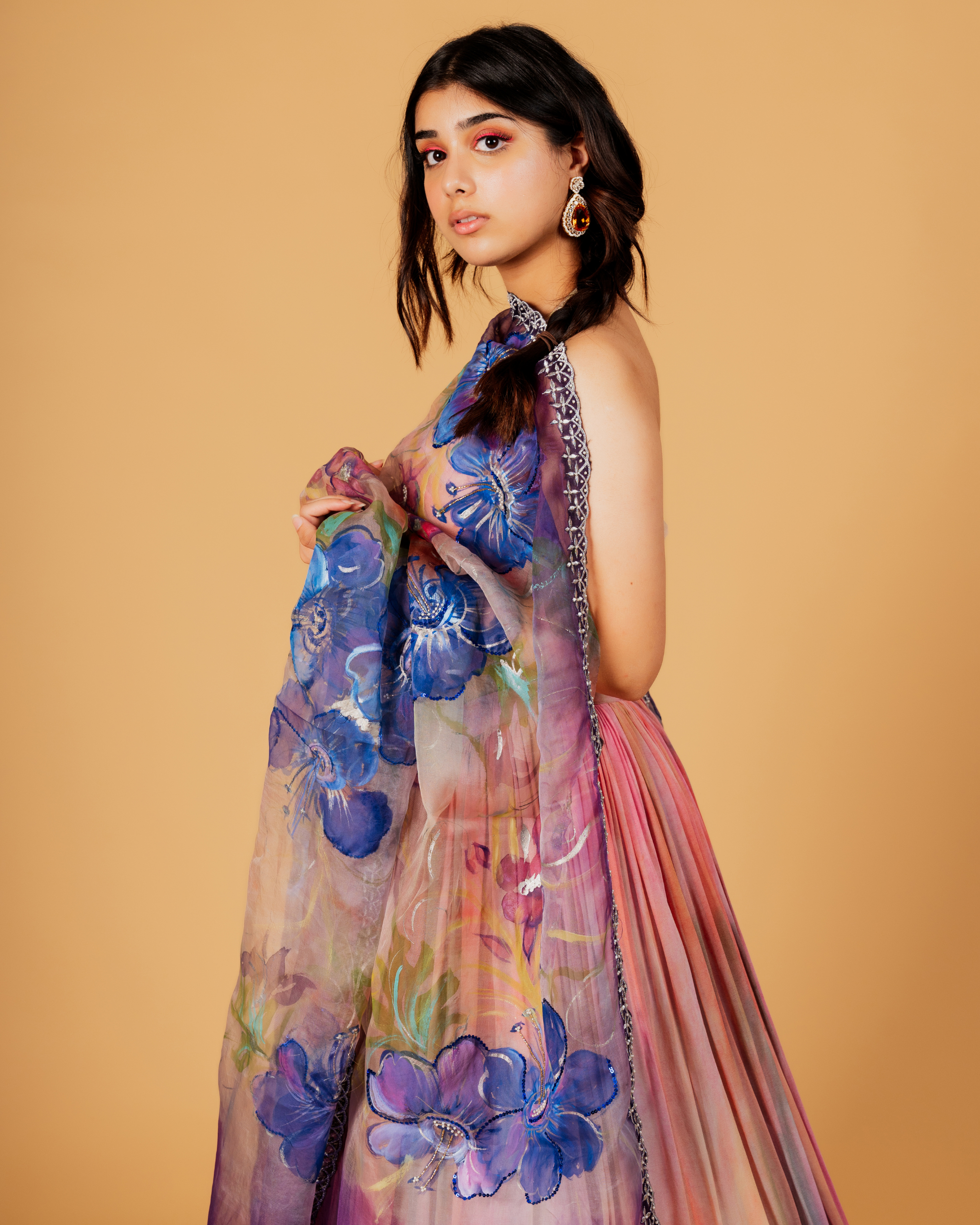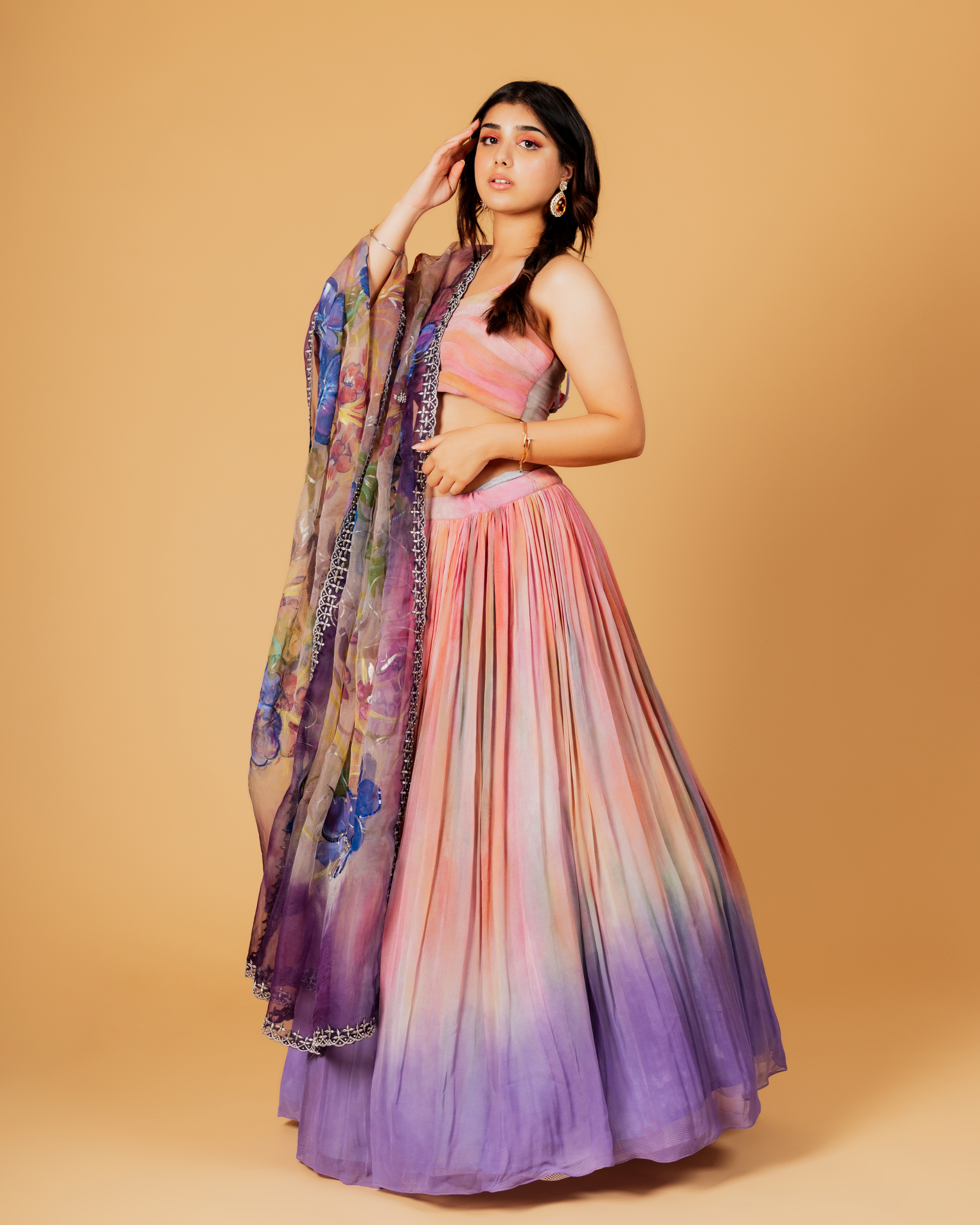 This georgette lehenga set features an ombré skirt, blending peach, pink, lilac, and sun yellow, with deeper tones at the hem and lighter hues at the waist. The pleated blouse has delicate shoulder ties at the back. The dupatta showcases passion flowers with purple trumpets, scarlet, and burnt orange buds, framed by a geometric purple and silver border. Scattered beads add a luminous touch across the flowers and throughout the fabric.