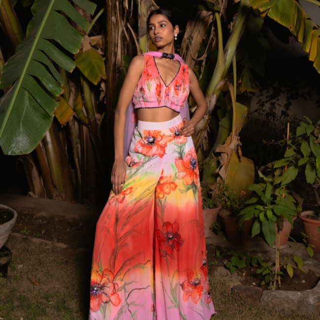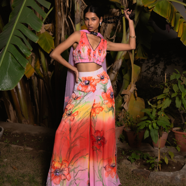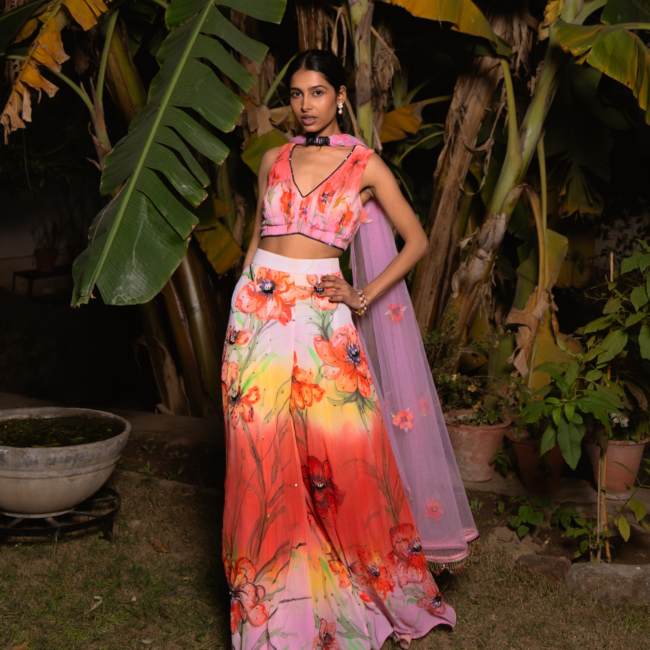 This set features a pleated blouse in scarlet pink and sun yellow, adorned with delicate painted poppies. The layered Sharara pants showcase bold poppies in pink, scarlet, yellow, and light pink. A net dupatta with appliqué poppies and beaded lace complements the ensemble, while bead embroidery adds shimmer to the lehenga’s floral details.