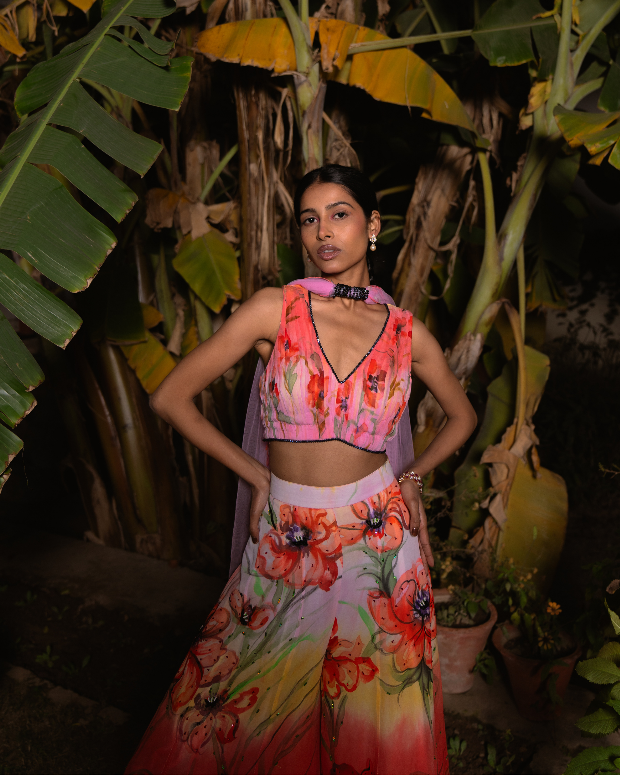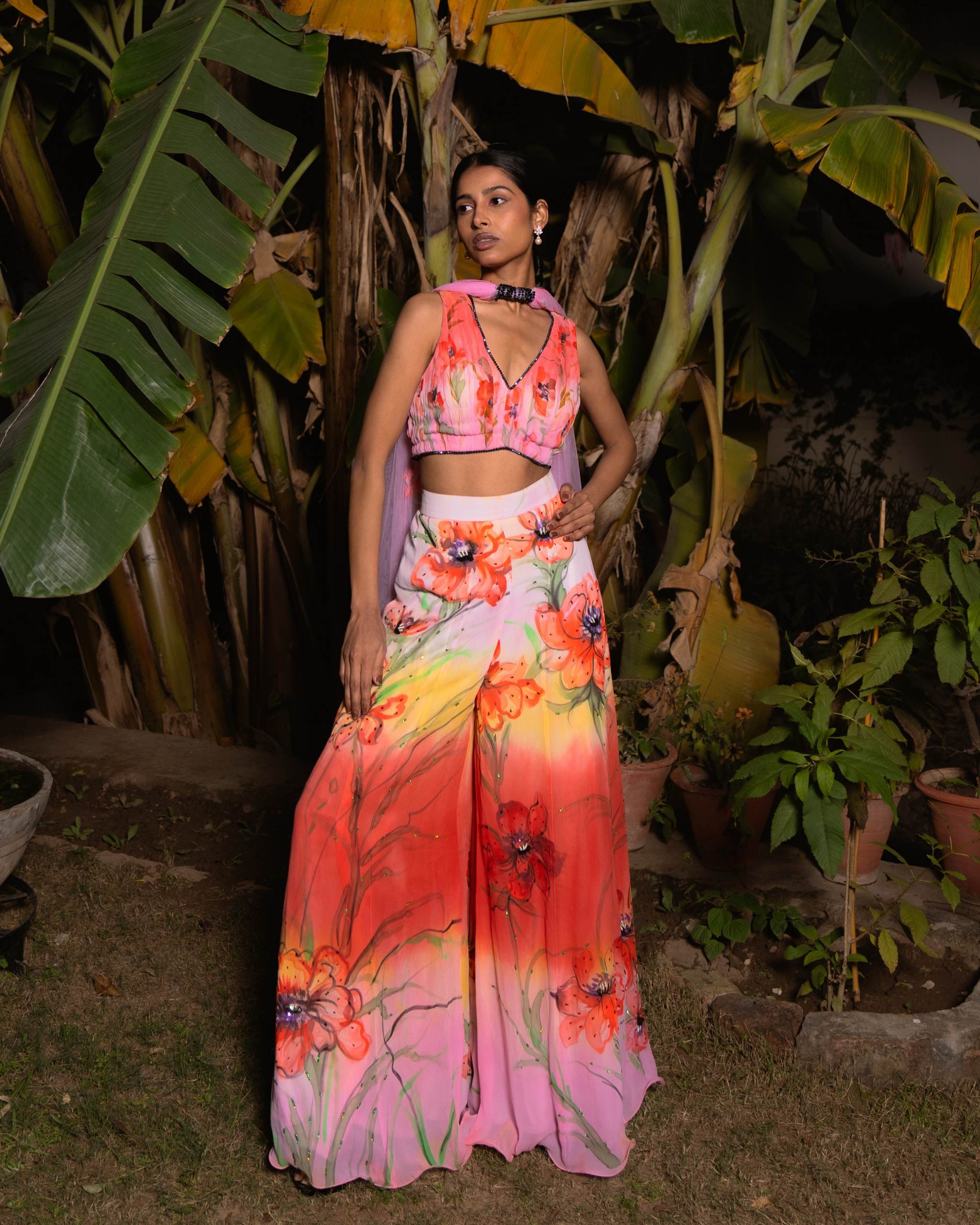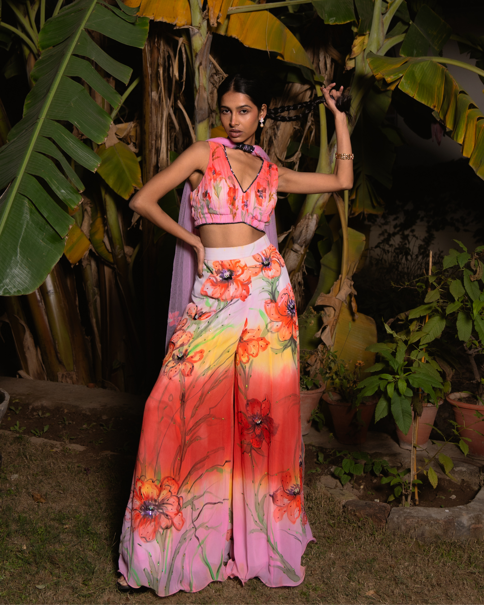 This set features a pleated blouse in scarlet pink and sun yellow, adorned with delicate painted poppies. The layered Sharara pants showcase bold poppies in pink, scarlet, yellow, and light pink. A net dupatta with appliqué poppies and beaded lace complements the ensemble, while bead embroidery adds shimmer to the lehenga’s floral details.