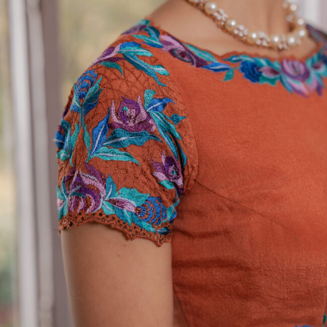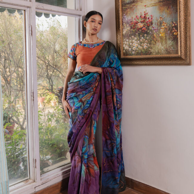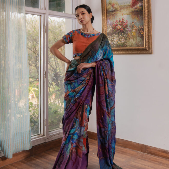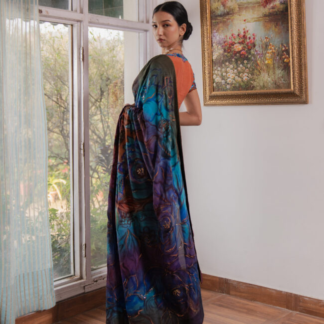A 9-yard Kashmiri Chinon saree, hand-painted in cyan, deep firozi, purple, and wine with bold roses and wooden hydrangeas. Light sequins trace the floral lines, accented with gold and copper rectangles. Finished with delicate lace. Paired with a contrasting wood-toned blouse featuring threadwork roses and embroidered cutwork sleeves.