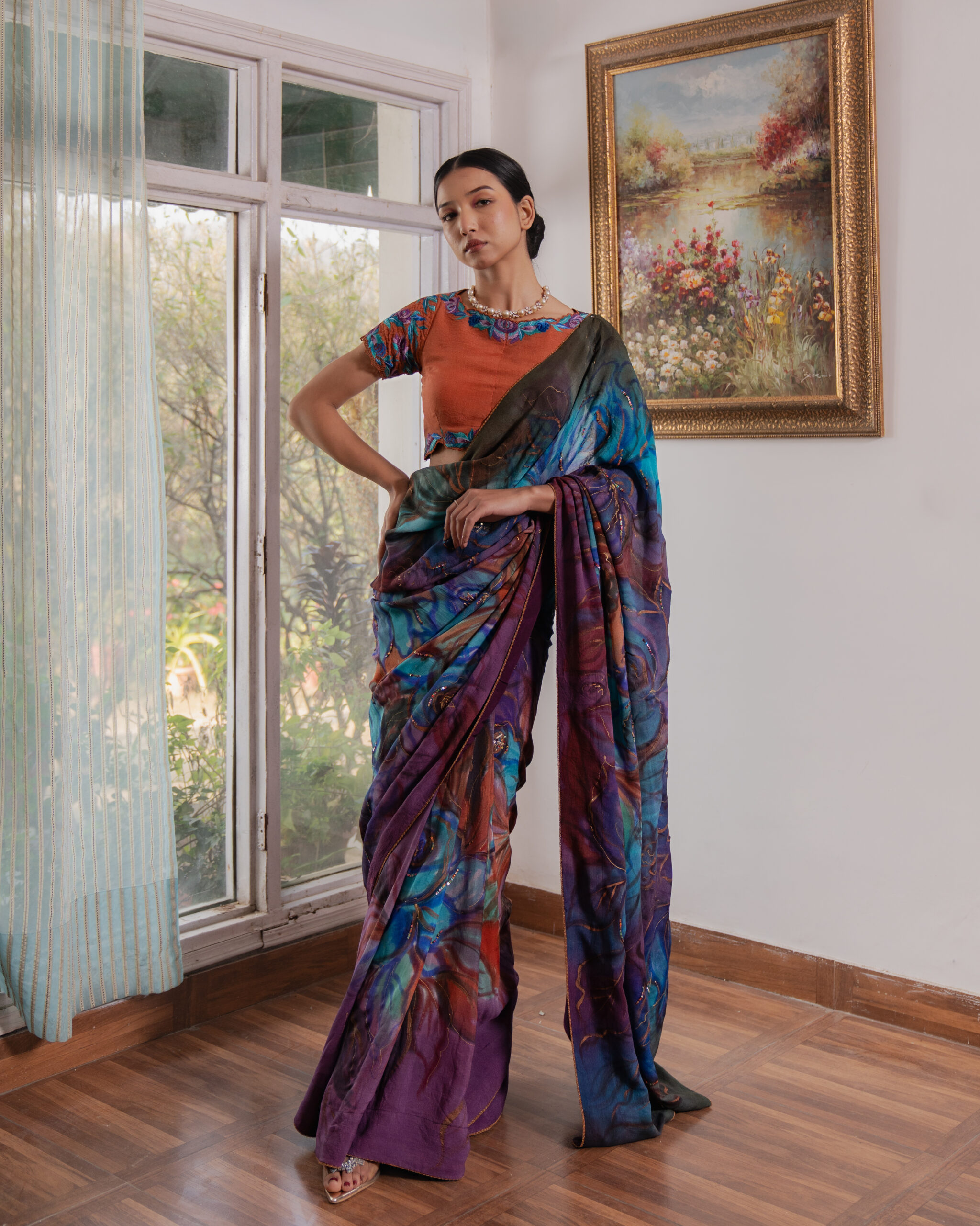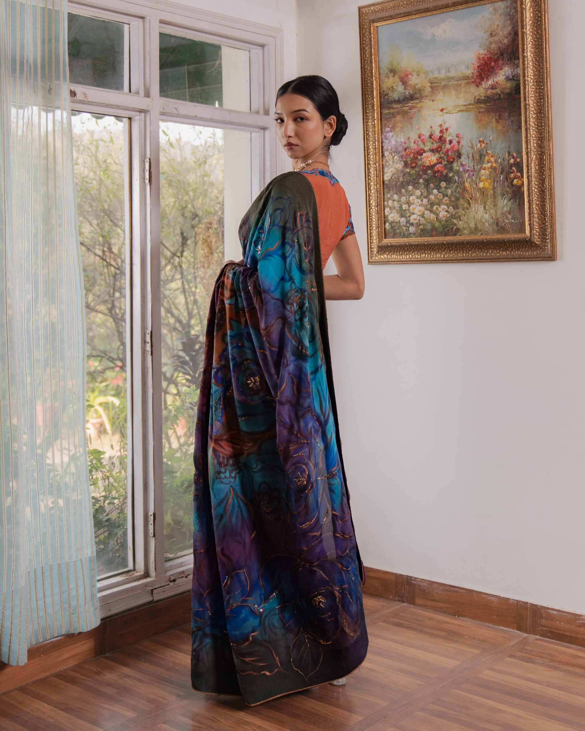 A 9-yard Kashmiri Chinon saree, hand-painted in cyan, deep firozi, purple, and wine with bold roses and wooden hydrangeas. Light sequins trace the floral lines, accented with gold and copper rectangles. Finished with delicate lace. Paired with a contrasting wood-toned blouse featuring threadwork roses and embroidered cutwork sleeves.